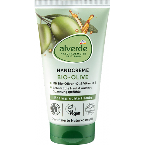 Крем для рук Olive від alverde NATURKOSMETIK забезпечує приємний догляд за втомленими руками. Збагачена органічною оливковою олією, сертифікована натуральна косметична формула інтенсивно живить шкіру та може пом'якшити відчуття стягнутості при сухості. Вона забезпечує тривале зволоження, а вітамін Е, що входить до складу, допомагає захистити шкіру від вільних радикалів. Сертифікована натуральна косметика добре вбирається і залишає відчуття м'якої та еластичної шкіри, забезпечуючи догляд за руками з усіх боків.Номер артикулу dm: 1455000GTIN: 4066447912920