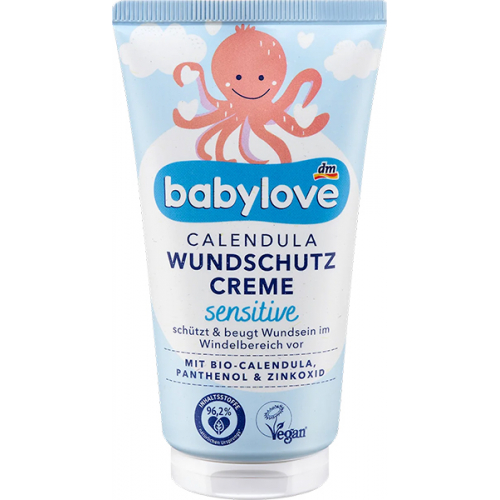 Крем для захисту від подразнень babylove Calendula захищає ніжну шкіру немовлят від подразнень в області підгузника. Доглядаюча формула заспокоює шкіру та сприяє зникненню почервоніння. Формула з органічною календулою, пантенолом і оксидом цинку утворює ефективну плівку, захищаючи подразнену шкіру в області підгузника від вологи. Сумісність зі шкірою підтверджена дерматологічно.