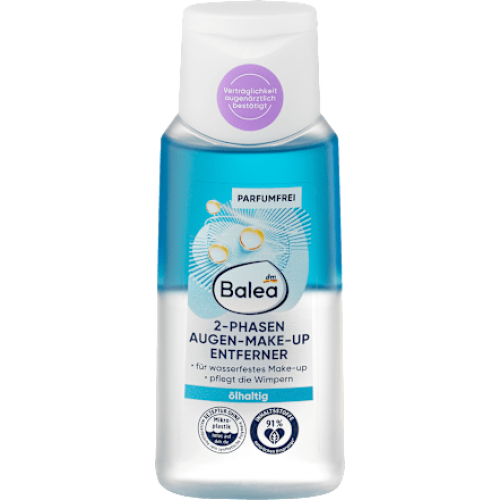 Засіб для зняття макіяжу з очей Balea м'яко та швидко очищує шкіру. Сумісність зі шкірою підтверджена дерматологічно та офтальмологічно. Підходить для користувачів контактних лінз. Інгредієнти на 91% мають натуральне походження (відповідно до ISO 16128).
