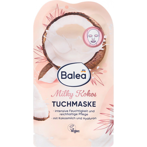 Маска-серветка Balea Milky Cocos — це багатий засіб для догляду, який дарує сяючий вигляд і відчуття оксамитової шкіри. Її живильна формула з гіалуроном і кокосовим молоком інтенсивно зволожує шкіру. За умови регулярного застосування маска може допомогти згладити перші зморшки й зробити шкіру гладеньшою. М’яка серветка ніжно прилягає до обличчя, а приємний кокосовий аромат розслабляє почуття й дарує момент задоволення.