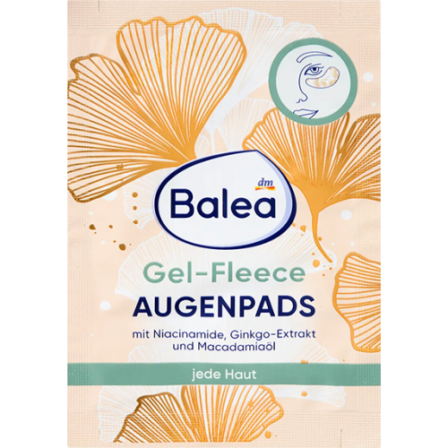 Гелеві флісові подушечки для очей Balea забезпечують інтенсивний догляд за ніжною шкірою навколо очей. Зі своїм золотистим принтом гінкго ці елегантні гелеві флісові подушечки забезпечують освіжаючий ефект і допомагають помітно зменшити незначну набряклість. Формула збагачена ніацинамідом, екстрактом гінкго та олією макадамії, що забезпечує зволоження зони навколо очей. Для свіжого вигляду та моменту розслаблення.