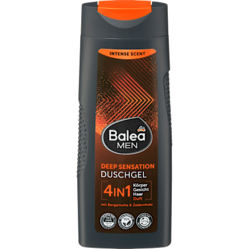 Гель для душу Deep Sensation від Balea MEN поєднує в собі високоякісний догляд та інтенсивний аромат – щодня. Завдяки формулі 4 в 1 текстура ідеально підходить для тіла, обличчя та волосся, а також має привабливий аромат бергамоту та кедра.