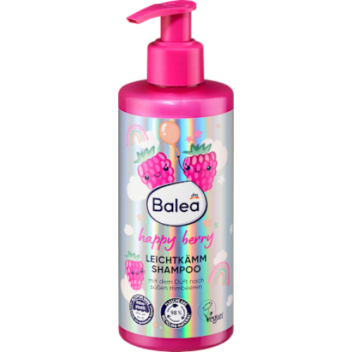Шампунь Happy Berry від Balea з легким розчісуванням м'яко очищає та доглядає волосся. Приємний аромат малини забезпечує фруктово-солодке задоволення від догляду. Шампунь має нейтральний для шкіри pH і підходить навіть для чутливої шкіри. Після миття волосся залишається м'яким, гладким і блискучим. Формула без мікропластику та водорозчинних синтетичних полімерів.