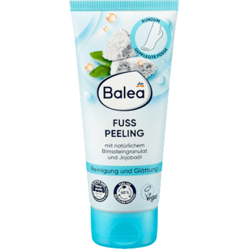 Пілінг для ніг від Balea очищає та згладжує шкіру ніг. Ніжно видаляє омертвілі частинки шкіри. Інтенсивне зволоження завдяки комплексу з гліцерином, олією жожоба, екстрактом кінського каштана, сечовиною та вітаміном Е забезпечує м'якість та еластичність стоп. Формула без мікропластику та водорозчинних синтетичних полімерів.