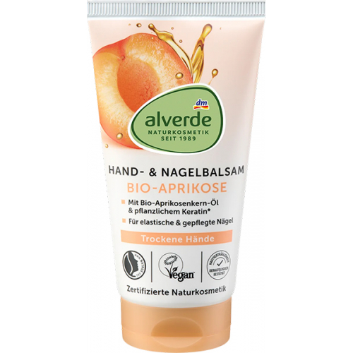 Бальзам для рук і нігтів з олією абрикосових кісточок та рослинним кератином від alverde NATURKOSMETIK дбає про доглянутість рук і нігтів. Ця розкішна формула догляду була спеціально розроблена для сухих рук та пошкодженої кутикули. Вона інтенсивно зволожує та помітно розгладжує шкіру. Сертифікована натуральна косметика з органічною олією абрикосових кісточок та рослинним кератином підтримує еластичність нігтів і таким чином запобігає їх ламкості. Як сертифікована натуральна косметика, бальзам не містить повністю синтетичних ароматизаторів, барвників та консервантів.
