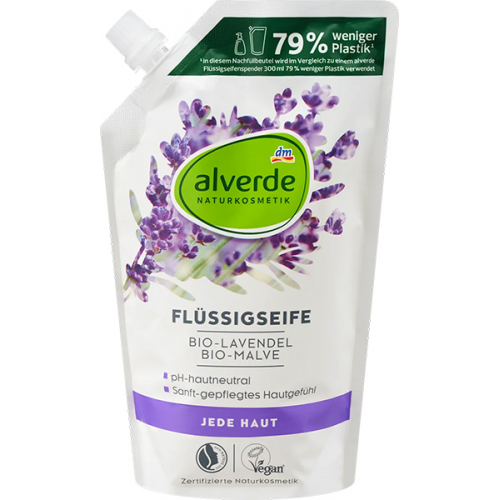 Рідке мило з органічною лавандою та органічною мальвою в практичній упаковці для поповнення від alverde NATURKOSMETIK делікатно очищає та доглядає за руками. Композиція м'яких миючих речовин на рослинній основі, а також екстракти лаванди та мальви з контрольованого органічного вирощування забезпечують ніжне та дбайливе очищення, не пересушуючи шкіру. Квітковий аромат лаванди та мальви балує почуття та забезпечує приємне миття.