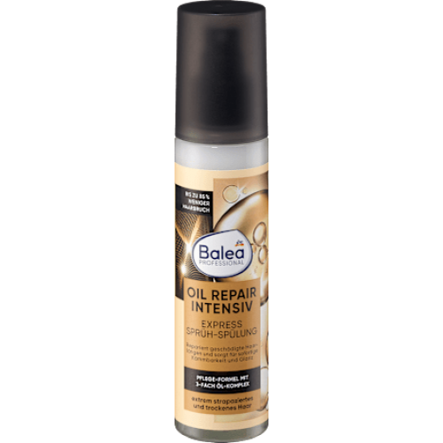 Спрей-кондиціонер Express Oil Repair Intensiv від Balea Professional відновлює пошкоджене волосся та забезпечує миттєве розчісування і блиск. Завдяки експрес-формулі з оліями аргана, марули та бабассу волосся набуває блискучого вигляду.
