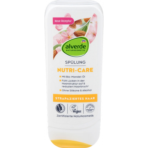 Кондиціонер Nutri-Care від alverde NATURKOSMETIK був спеціально розроблений для потреб пошкодженого волосся. Його насичена формула з комплексом догляду з пшеничного протеїну та аргініну допомагає заповнити прогалини в структурі волосся та покращити його стійкість. Крім того, формула з органічною мигдалевою олією, інуліном та рослинним гліцерином доглядає за волоссям, роблячи його помітно м'яким та полегшуючи розчісування. Сертифікована натуральна косметика не містить силіконів, завдяки чому волосся залишається природним на дотик.
