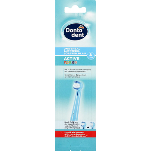Універсальні насадки Active Young синього кольору від Dontodent забезпечують до 5 разів кращу чистку міжзубних проміжків у порівнянні з ефективністю чищення звичайною дитячою ручною зубною щіткою*. Мала головка щітки спеціально розроблена для дітей і підходить до всіх акумуляторних зубних щіток Dontodent Active. Сині щетинки знебарвлюються, показуючи, коли настав час замінити насадку.