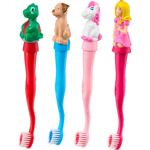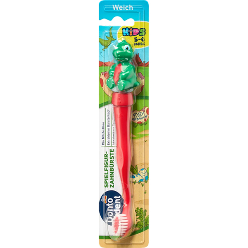 Зубна щітка Dontodent Kids з іграшкою розроблена спеціально для дітей віком від 3 до 6 років. Екстра маленька головка ідеально підходить для дитячої ротової порожнини та ретельно очищає молочні зуби. М'які щетинки дбайливо ставляться до зубів і ясен. Знімна іграшка додає задоволення та мотивації під час чищення зубів. Завдяки вигнутій головці можна без зусиль очистити навіть важкодоступні місця в задній частині ротової порожнини.