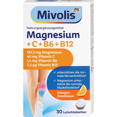 У періоди сильного фізичного навантаження, наприклад під час занять спортом, може виникнути підвищена потреба в магнії та вітамінах. Mivolis Магній + Вітамін С + Вітамін В6 + В12 містить важливі поживні речовини, які не можуть бути синтезовані організмом самостійно. Магній, як один з найбільш універсальних мінералів, сприяє нормальній роботі м'язів і нервів, а також підтримці нормального стану кісток. Крім того, магній сприяє нормальному енергетичному обміну. Вітаміни С, В6 і В12 виконують безліч функцій в організмі; у поєднанні з магнієм вони, наприклад, підтримують нервову систему. Вітамін С сприяє нормальній роботі імунної системи і разом з вітамінами В6 і В12 може сприяти зменшенню втоми і виснаженості. Пастилки мають приємний апельсиновий смак.