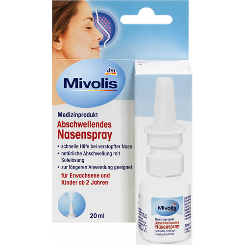 Набряклі слизові оболонки носа часто є причиною відчуття «закладеності носа» і типовими симптомами застудних захворювань верхніх дихальних шляхів, нежитю та сінної нежитю. М'якою альтернативою є спрей для носа Mivolis, що знімає набряк, оскільки гіпертонічний сольовий розчин забезпечує природне зняття набряку та полегшує дихання. Спрей для носа Mivolis, що знімає набряк, можна застосовувати для зняття набряку, зволоження та очищення слизової оболонки носа при закладеності, сухості або забрудненні пилом та пилком. Без ефекту звикання. Назальний спрей Mivolis не містить консервантів та алкоголю.