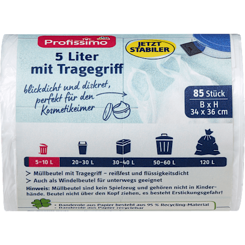 5-літрові сміттєві пакети з ручкою для перенесення від Profissimo для косметичних відер забезпечують дискретне видалення сміття завдяки білому забарвленню. Крім того, вони міцні та водонепроникні. Ручка для перенесення дозволяє легко зав'язати мішок.