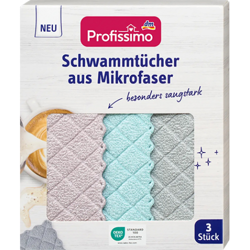 Поєднання технології губки та мікрофібри робить серветки з мікрофібри від Profissimo надійним помічником у побуті. Завдяки 3D-структурі поверхні серветки вбирають особливо багато води і забезпечують ретельне очищення завдяки стільниковій структурі – без використання хімічних миючих засобів. Вони підходять як для кухні, так і для ванної кімнати і можуть використовуватися у вологому або сухому вигляді.