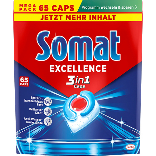 Таблетки для посудомийної машини Excellence 3in1 від Somat надійно очищають посуд та надають йому блиску. Завдяки інноваційному поєднанню твердого гелю Power Gel і порошку з цитратом таблетки видаляють навіть найстійкіші жирні та харчові залишки, навіть при низьких температурах або в еко-програмі. Спеціальна формула ефективно бореться з плямами від води та забезпечує бездоганний результат на посуді та склянках. Завдяки біорозкладній, водорозчинній оболонці таблетки особливо прості у використанні.