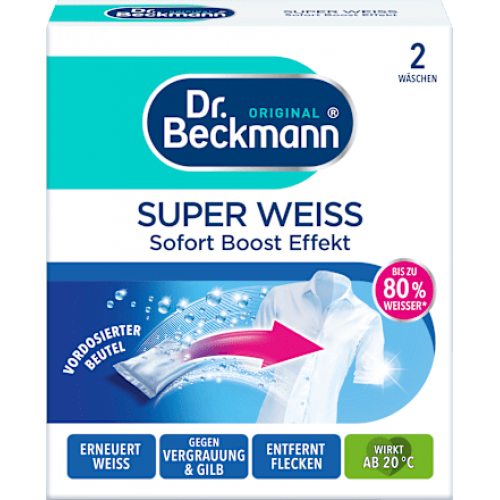 Часте прання при низьких температурах або вапняні відкладення в пральному порошку часто призводять до пожовтіння та посіріння білизни. Dr. Beckmann Super Weiß усуває посіріння і повертає білій білизні колишній блиск. Порційні пакетики для прання можна додавати безпосередньо до білої білизни в барабан пральної машини.