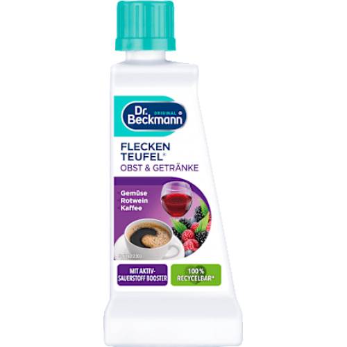 Засіб Dr. Beckmann Fleckenteufel Obst & Getränke з активним киснем видаляє плями від червоного вина, кави, чаю, фруктів і овочів, а також плями від соку, какао, цвілі та цвілі. При цьому він береже кольори і тканини. Підходить для прання та непрання текстильних виробів.