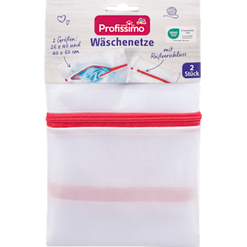 З сіткою для прання з вбудованою блискавкою від Profissimo можна нарешті покласти край таємничому зникненню шкарпеток, оскільки під час прання вони надійно утримуються всередині сітки. Завдяки двом різним розмірам сіток, кожен предмет одягу має достатньо місця, що запобігає взаємному пошкодженню текстильних виробів. Незамінний предмет у побуті, що продовжує термін служби одягу.
