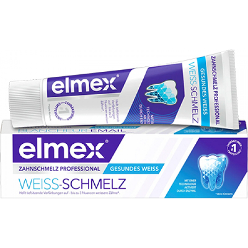 Зубна паста elmex Емаль Професіонал Біла Емаль може видалити звичайні плями, які з часом накопичилися на емалі зубів*. Спеціальна технологія відбілювання активується ферментами і може зробити зуби білішими на три відтінки*. Спеціальна формула може освітлити глибокі потемніння, коректуючи колір зубної емалі*. При цьому чистячі та очищувальні компоненти допомагають видалити поверхневі потемніння.